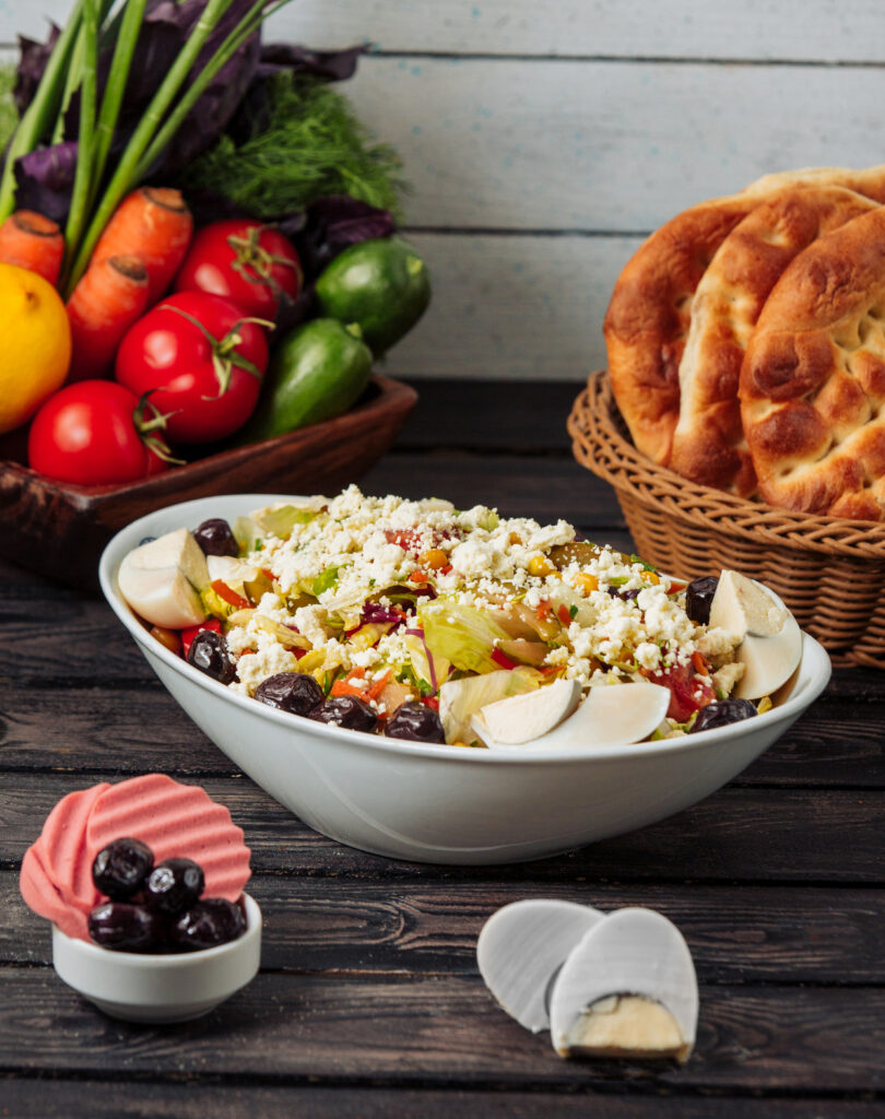 Add a mix of colorful veggies like cucumber, cherry tomatoes, red onion, and bell peppers for crunch, antioxidants, and vibrant Mediterranean flavor.